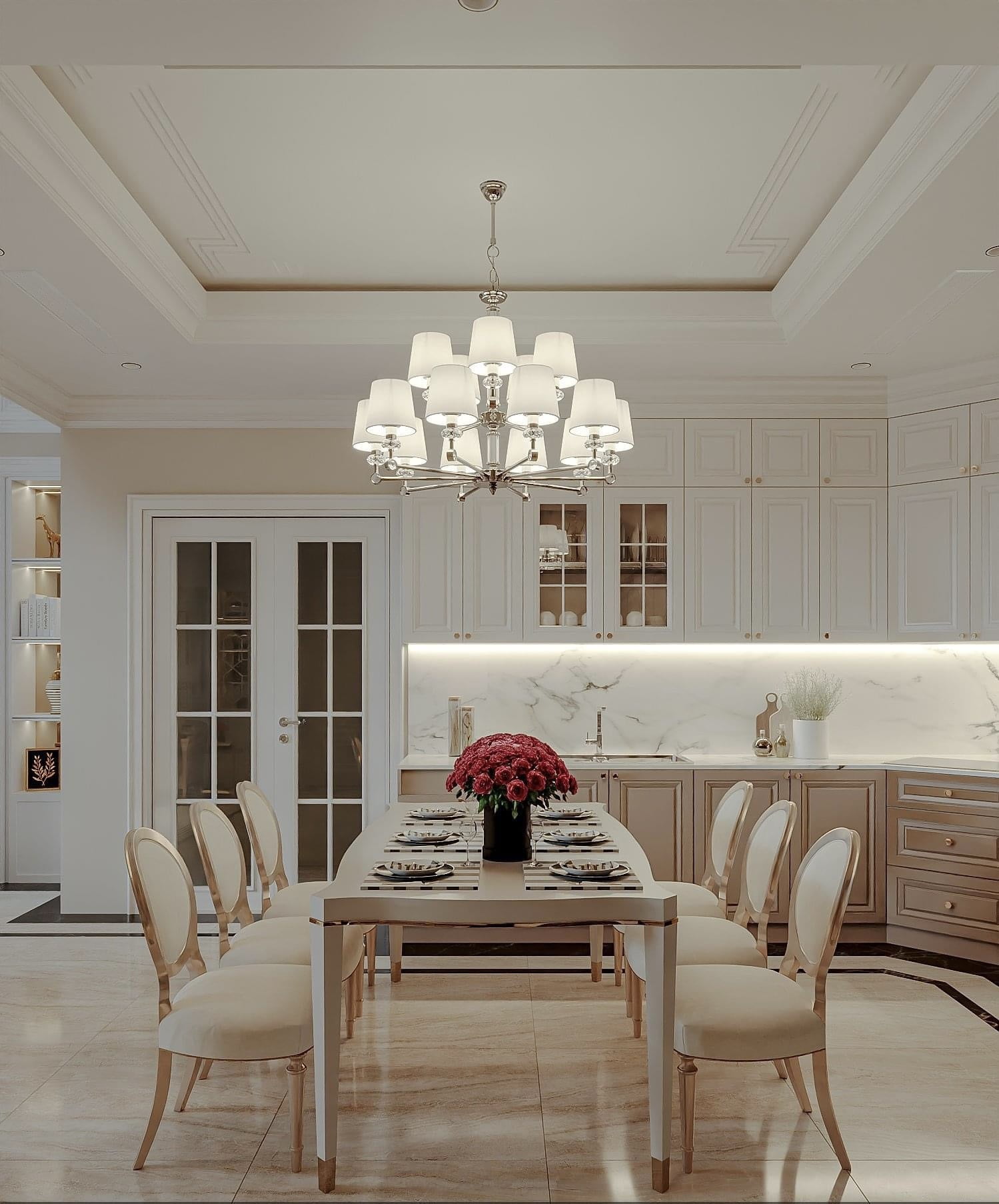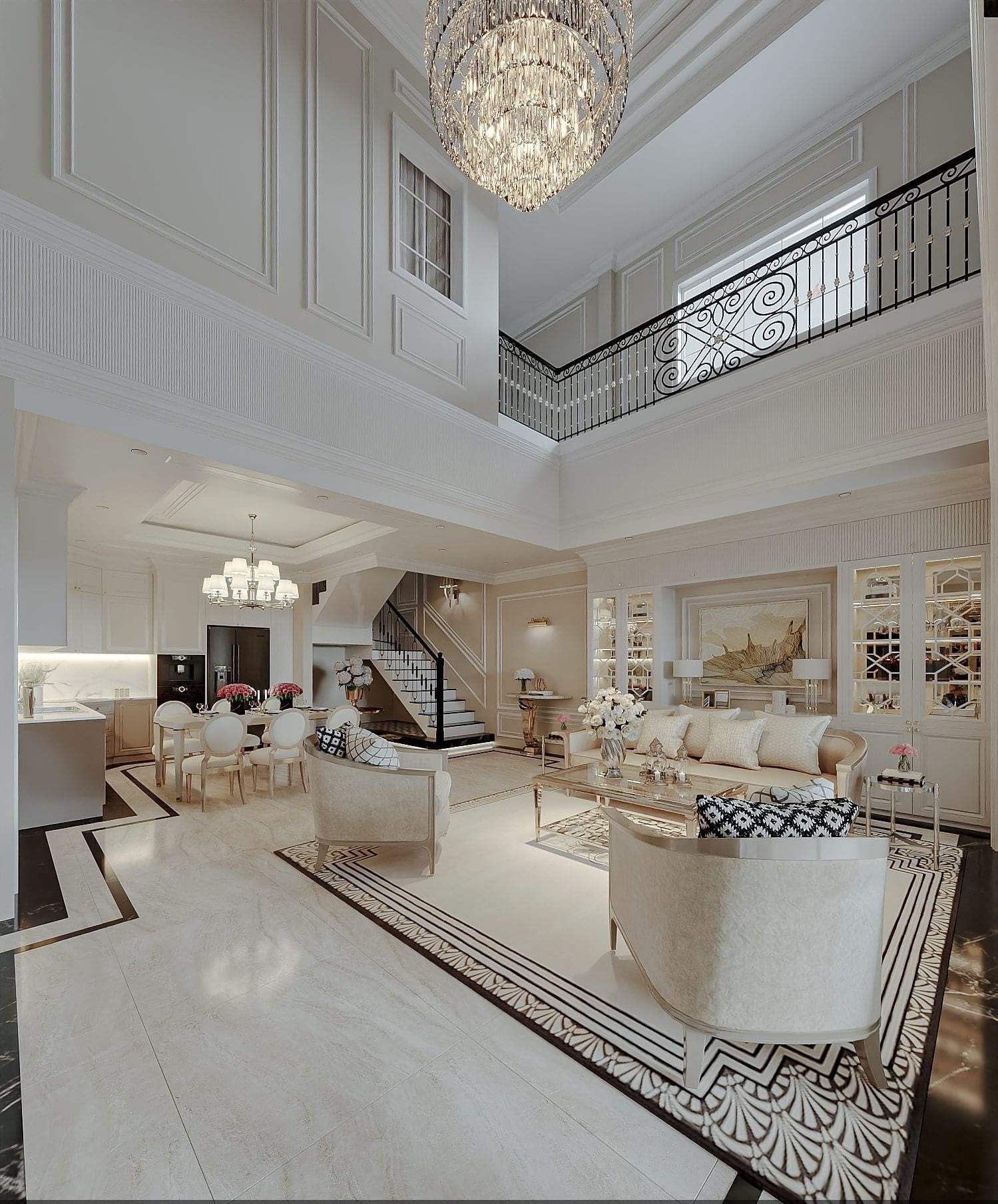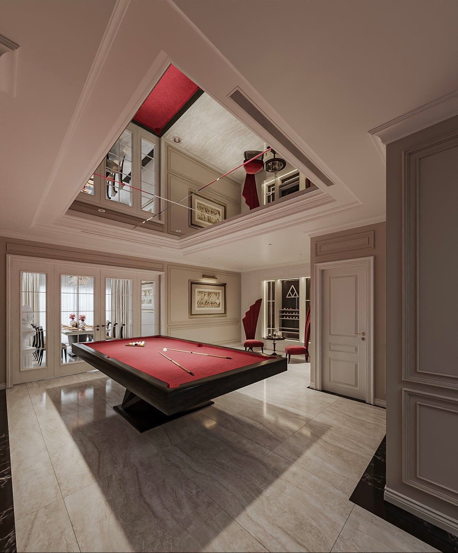 Sự tương phản thú vị giữa tổng thể trang trọng và tối giản với vẻ độc đáo từ hình khối của đồ rời như lưng tựa armchair, mặt bàn trà, khung ghế ăn, chân tủ tab,…Nhẹ nhàng nhưng đủ để tạo điểm nhấn hút mắt cho căn biệt thự.